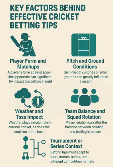Cricket betting tips are generally created by combining hard data with situational factors. That includes key statistics, such as batting averages, bowling economy, strike rates, as well as recent form. All of this is assessed alongside external factors like weather forecasts, pitch conditions, and the impact of the toss.
