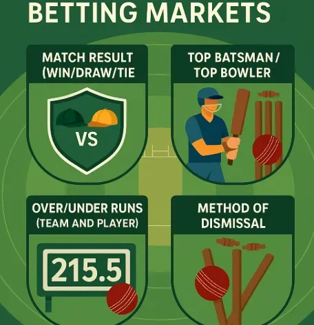 - Markets – Popular options include Match Result, Top Batsman/Bowler, Run Totals, and In-Play bets.