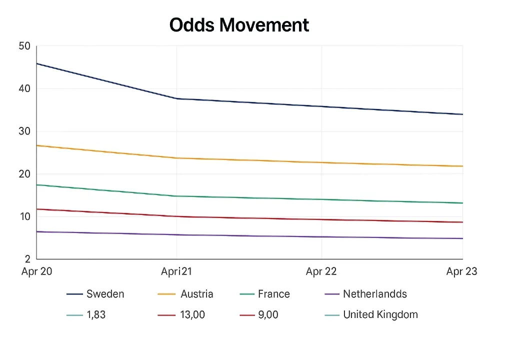 - 10 March 2025: Early betting previews from UK analysts list Sweden, Austria, and France as top-tier contenders. Meanwhile, the Netherlands quietly gains support on fan forums and social media. Though lacking mainstream coverage, its entry shows signs of becoming a sleeper hit.Odds movement: Netherlands 33.0 → 21.0