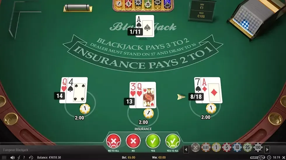 - Insurance: An Insurance bet will offer a 2:1 payout if the dealer holds blackjack.