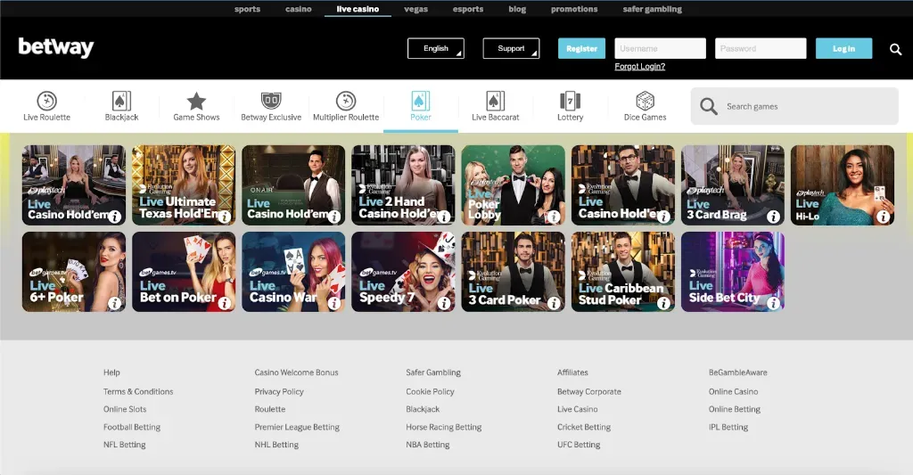 Live poker variants will be found in the ‘Live Casino’ section of a UK online casino. This will usually be identifiable in a control panel. It may also be possible to find table games available, which are likely to be located in a ‘Table Games’ section or by searching for ‘Poker’ in the casino games library.